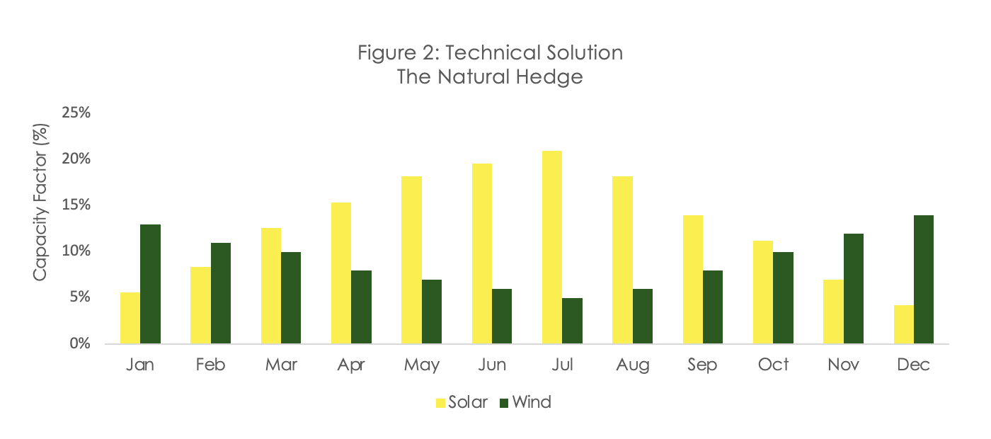 Figure 2 illustrates the structural complementarity of the portfolio resources. While solar capacity factors (yellow) peak during the summer months, the region’s specific wind corridors (green) drive maximum production during the winter. This counter-cyclical correlation naturally smooths the annual output profile, mitigating the “winter revenue valley” typical of solar-only assets and increasing the portfolio's effective base load factor.